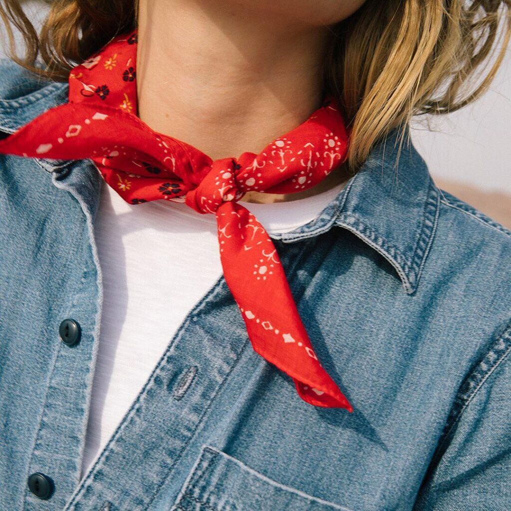 Façon rétro avec une paire de lunettes pour faire un tour en voiture décapotable (ou non). Plié en 2 pour former un triangle. On place le milieu du côté le plus long sur le sommet de sa tête et on croise les 2 extrémités au niveau du cou, puis on fait un nœud à la nuque. Mode vacances activé.