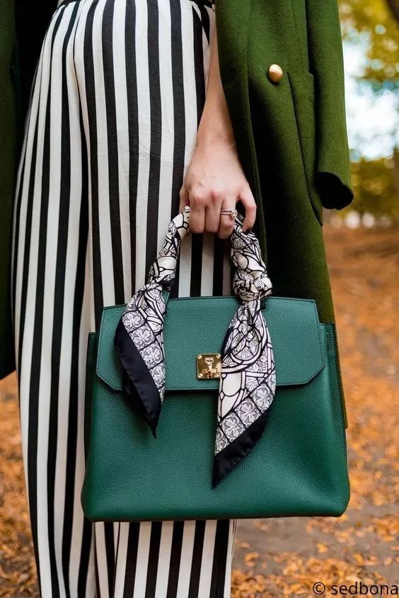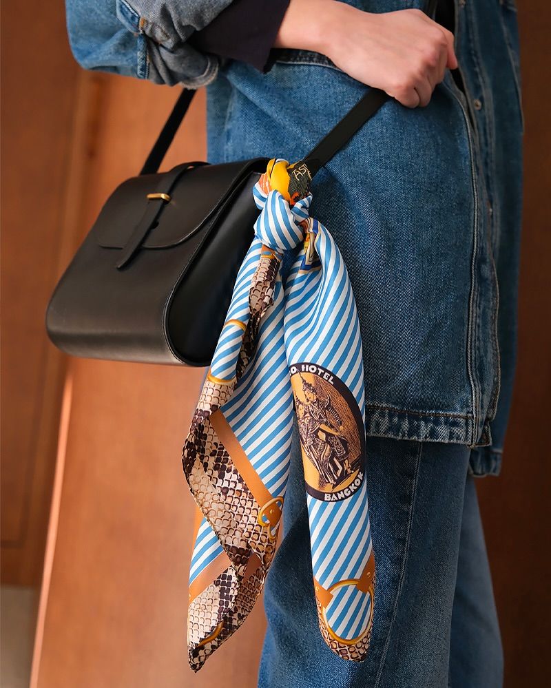 Nouée à l’anse du sac. Prennez un petit carré, voire la pochette d’un ami (le petit foulard que les hommes portent à la poche poitrine de leur blazer), et un sac en cuir souple ou rigide comme ceux des années 50 (il y en a des très beaux dans les boutiques de secondes main).