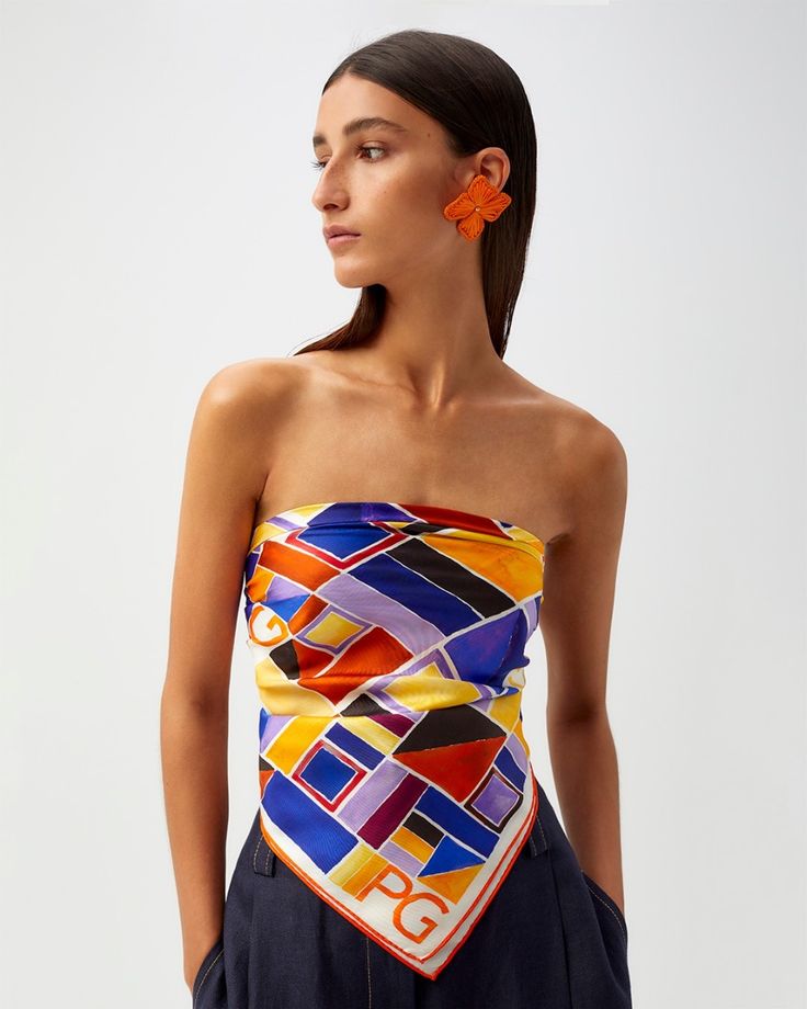 Pour une note plus boyish, on peut également nouer le foulard en cravate sur une belle chemise rentrée dans un pantalon carotte suivi d’une paire de slippers.